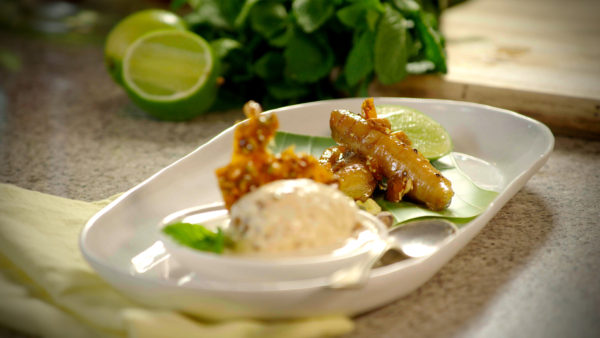 Caramelised banana with pistachio praline ice cream